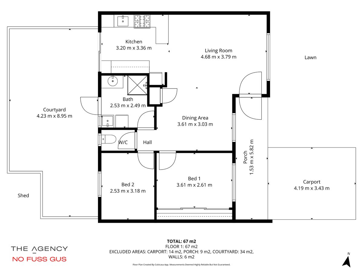 The main bedroom includes a full wall of built-in robes, a ceiling fan, and roller shutters for privacy and comfort, while the second bedroom sits conveniently nearby. The bathroom/laundry combination is well designed with a spacious shower and direct access to the courtyard.